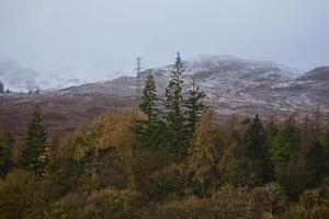 Evergreens standing before the mountains of Loch Lomond, Scotland. An autumnal setting that provides a moment of calm.